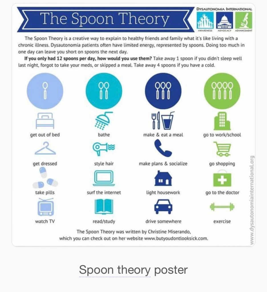 The spoon theory is an illustrative, easy to understand way to explain to a healthy person what it’s like to live with *insert chronic illness here*