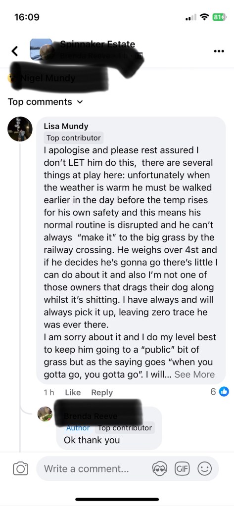 The post she wrote didn’t quite garner the response I think she was hoping for, not one person agreed with her and many many people placed a ❤️ on my response. I also received private messages of support from my neighbours and other people on the estate expressing their shock and disbelief at what she had written. Ha bloody ha, I win. I have to admit though her response to my comment with “ok thank you“ was genuinely disappointing. I was looking forward to changing tack and turning into my normal combative self, I only never got the opportunity. Sad times.