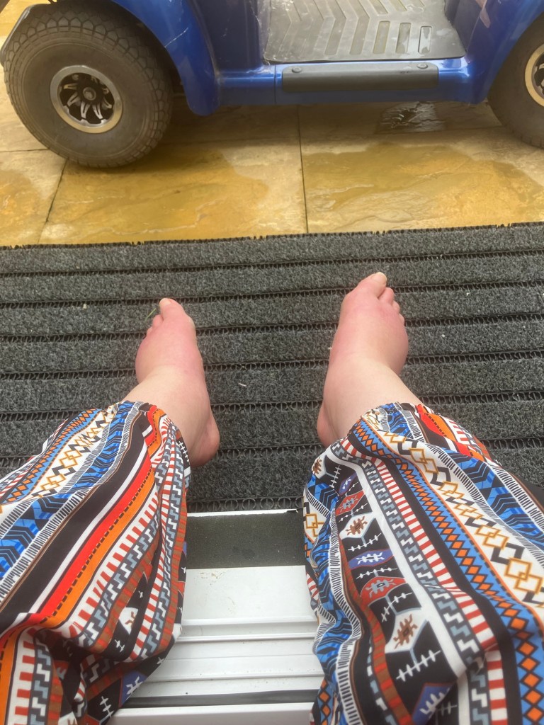 Up until recently I’ve been able to, much like getting in the shower, lean my weight on one leg while manually lifting the other over the threshold of the back door. This past week or so that has, annoyingly, become impossible. It’s not for want of trying though, believe me! After a dog walk (for him, “wheel” for me) I started my journey indoors; lean to the left, hmm no that didn’t work, lean to the right… nope, can’t get my fucking balance and both legs now seem to suddenly weigh 50kg each! Now, I ain’t no skinny-Minnie and I know it, but this is a piss take! The dog at this point has gone past me and buggered off into the lounge, I can hear the little bastard snoring on the sofa. The weather has turned so it’s a bit chilly and the colder I get the stiffer my legs get, which in this situation – massively counter productive. So with a final “tut” (I’d done a lot of that during this particular 20 minute ordeal) and a loud sigh I admitted defeat. I turned around and sat backwards in the doorway with my feet hanging out. (Did I mention that my feet are so swollen I can’t get any shoes on? Another super attractive side-effect of having largely immobile legs. Ooh my husband is a lucky boy… So all this is barefoot.)