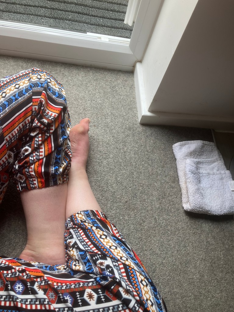 So from here I set about bum-shuffling backwards like I am walking on my bumcheeks – left cheek, right cheek, left cheek… it’s not quick (what is in my life these days?) until I can finally lift my feet over the threshold. Sitting on the floor for a few minutes I didn’t know whether I should be pleased to have made it indoors or despair at yet ANOTHER failure.