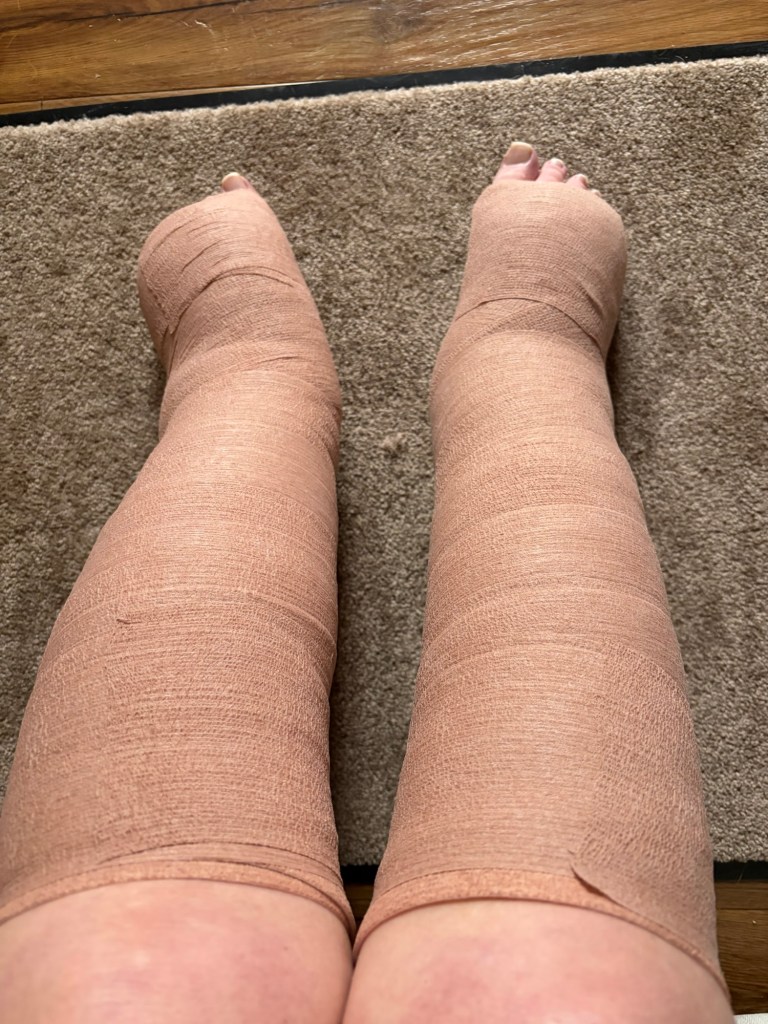 What I didn’t anticipate was that the standard NHS treatment for lymphoedema is bandaging. Three full weeks spent wrapped in tight, two-layer bandages that I can’t even shuffle around in so I had to wear socks over the top. I can’t tell you how glad I am that this has taken place during the winter because they were fucking HOT 🥵