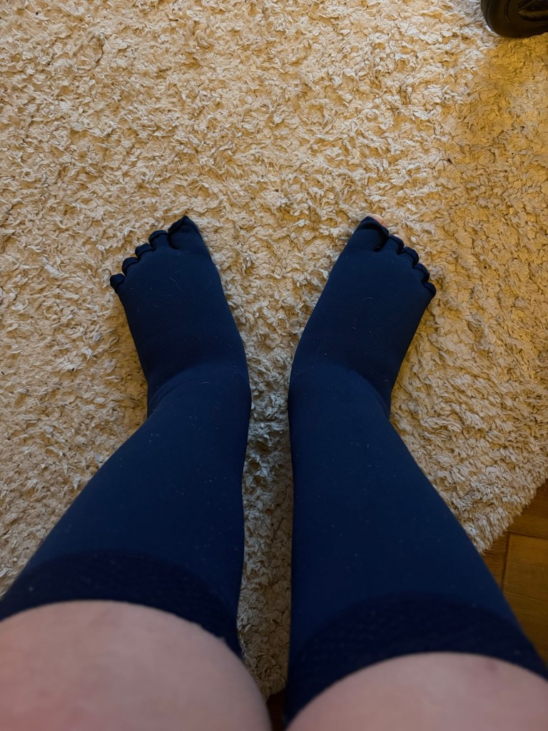 The goal of putting on shoes has been achieved though so that’s amazing, although I’m not looking forward to wearing these during the hot summer months it has to be said. The issue of getting these beauties on and off independently also remains, the lovely lymph nurses have supplied me with an “aid” to assist me with this task. Something that can only be described as a gigantic dildo that my dog barks incessantly at, it’s quite hilarious!
